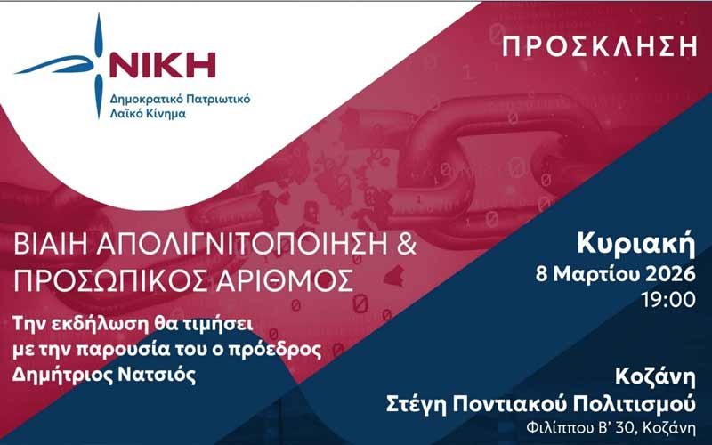 Η ΝΙΚΗ διοργανώνει εκδήλωση στην Κοζάνη, με αντιύο ζητήματα κομβικής σημασίας για την κοινωνία, την οικονομία και τη δημοκρατία: τη βίαιη απολιγνιτοποίηση και την καθιέρωση του Προσωπικού Αριθμού.